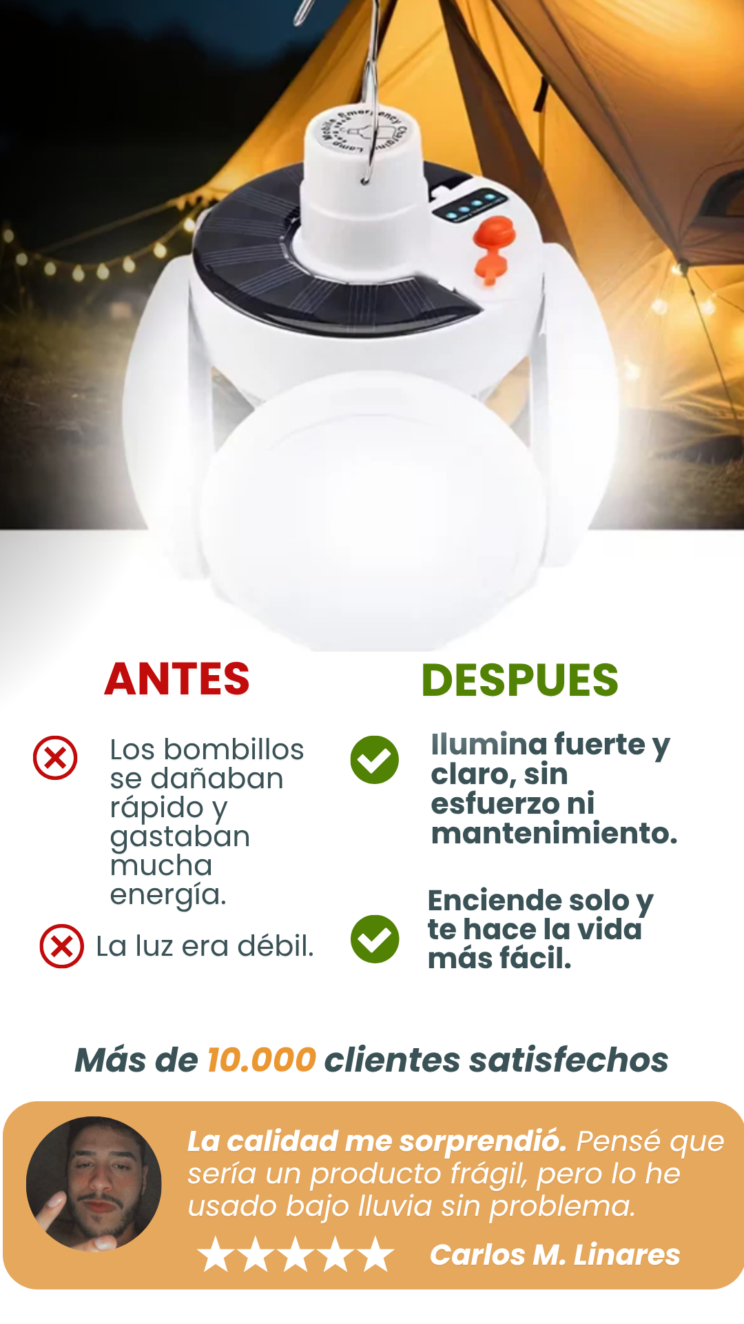 Foco solar expandible recargable que se ajusta a múltiples posiciones, con alta autonomía y diseño compacto.