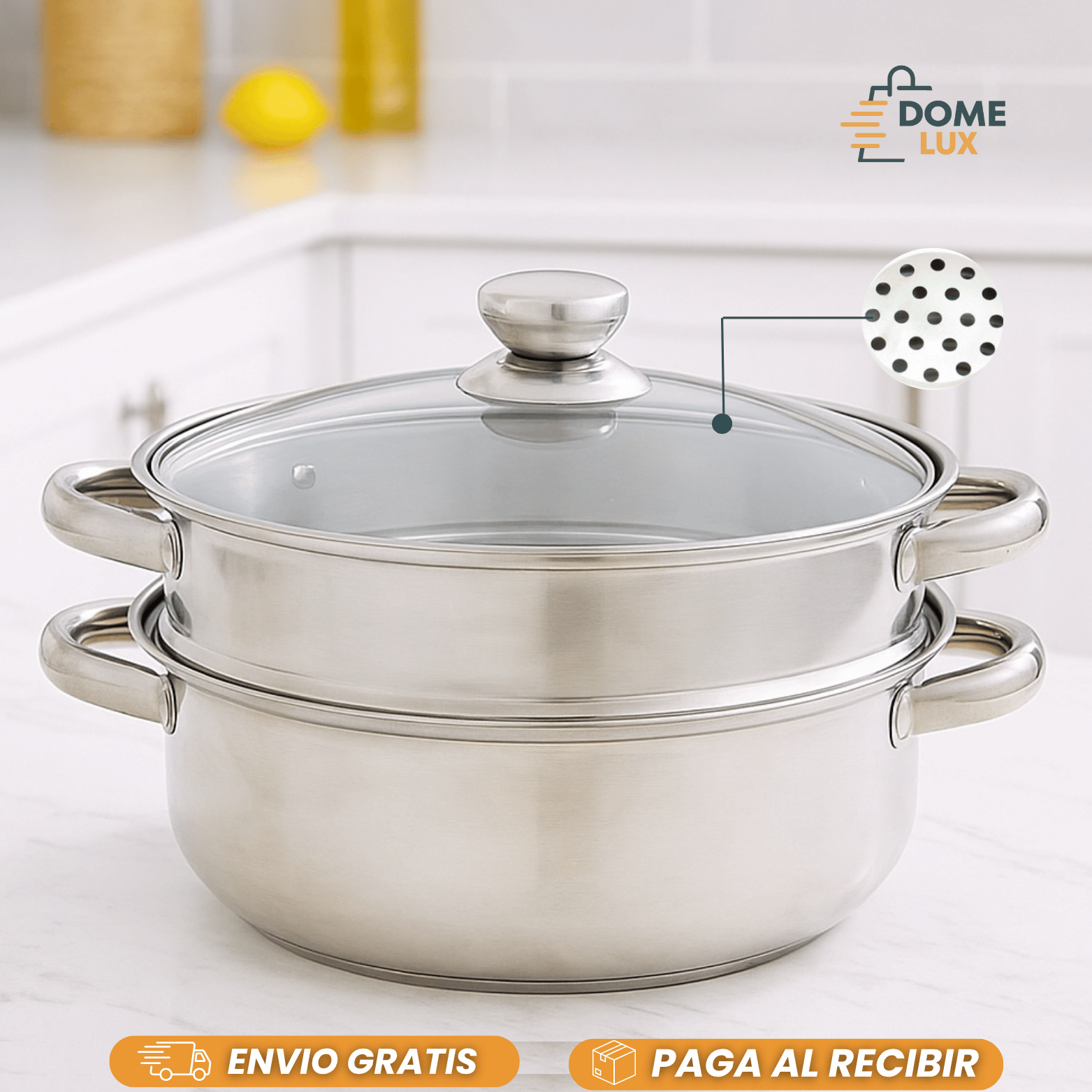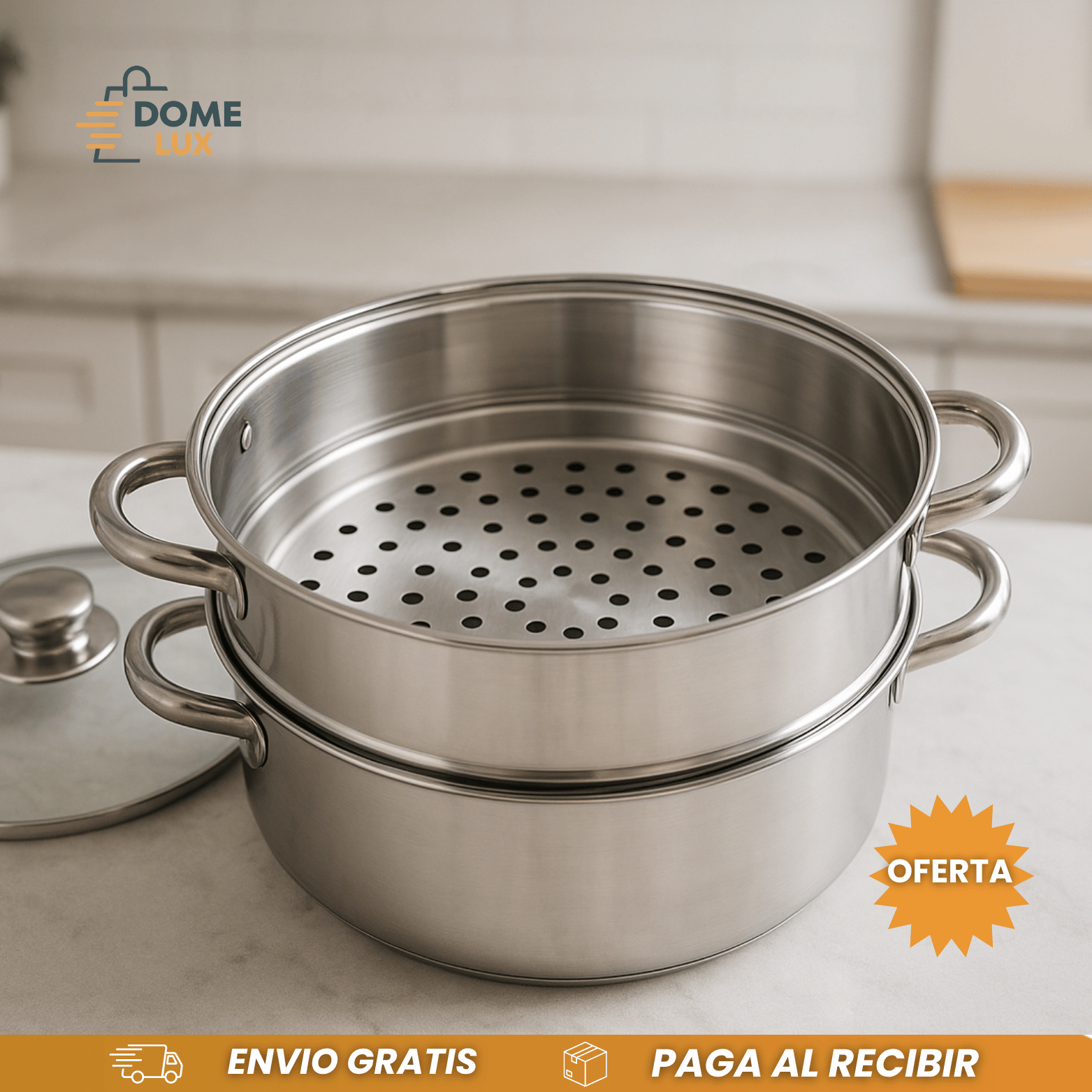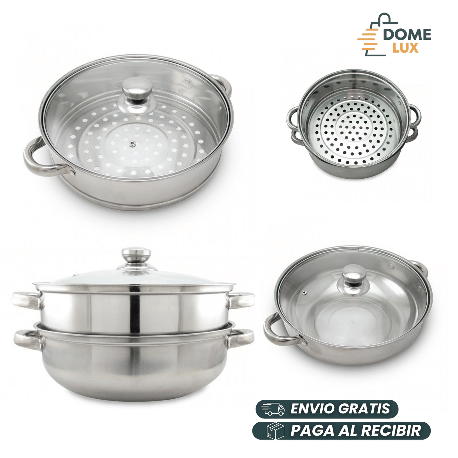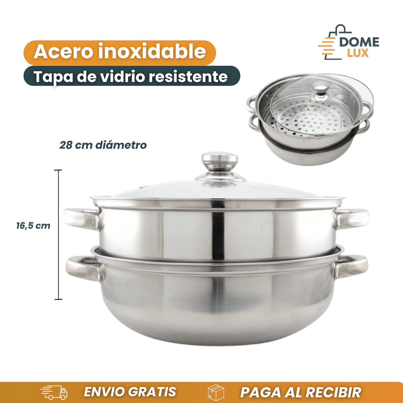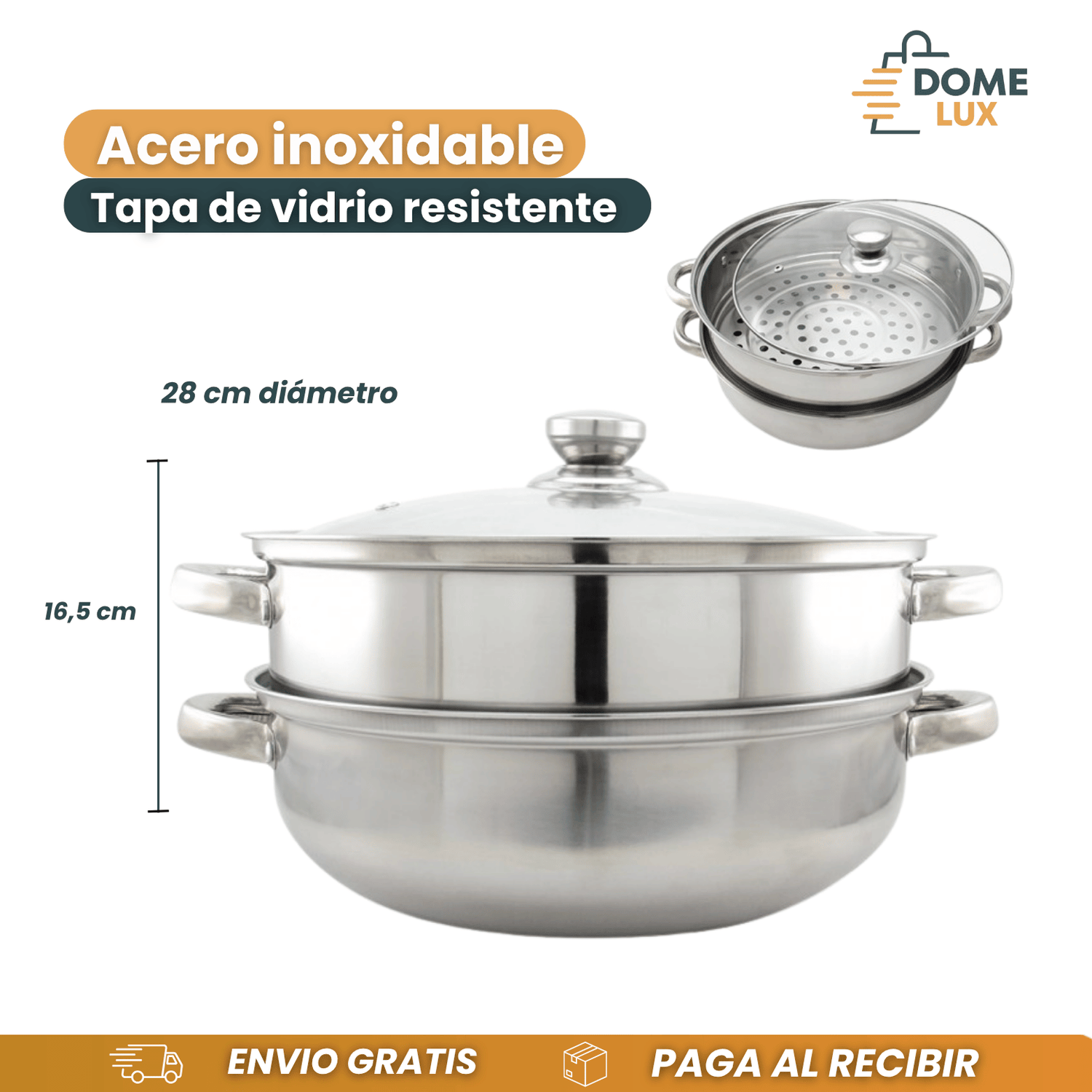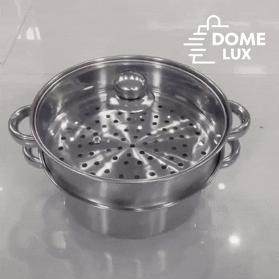 ✅ Tapa de acero o vidrio, mantiene el vapor y permite ver la cocción.